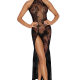 - Détails : Tulle floqué de motifs floraux, col tour de cou avec agrafes, dos nu à lanières de velours, coupe ajustée
